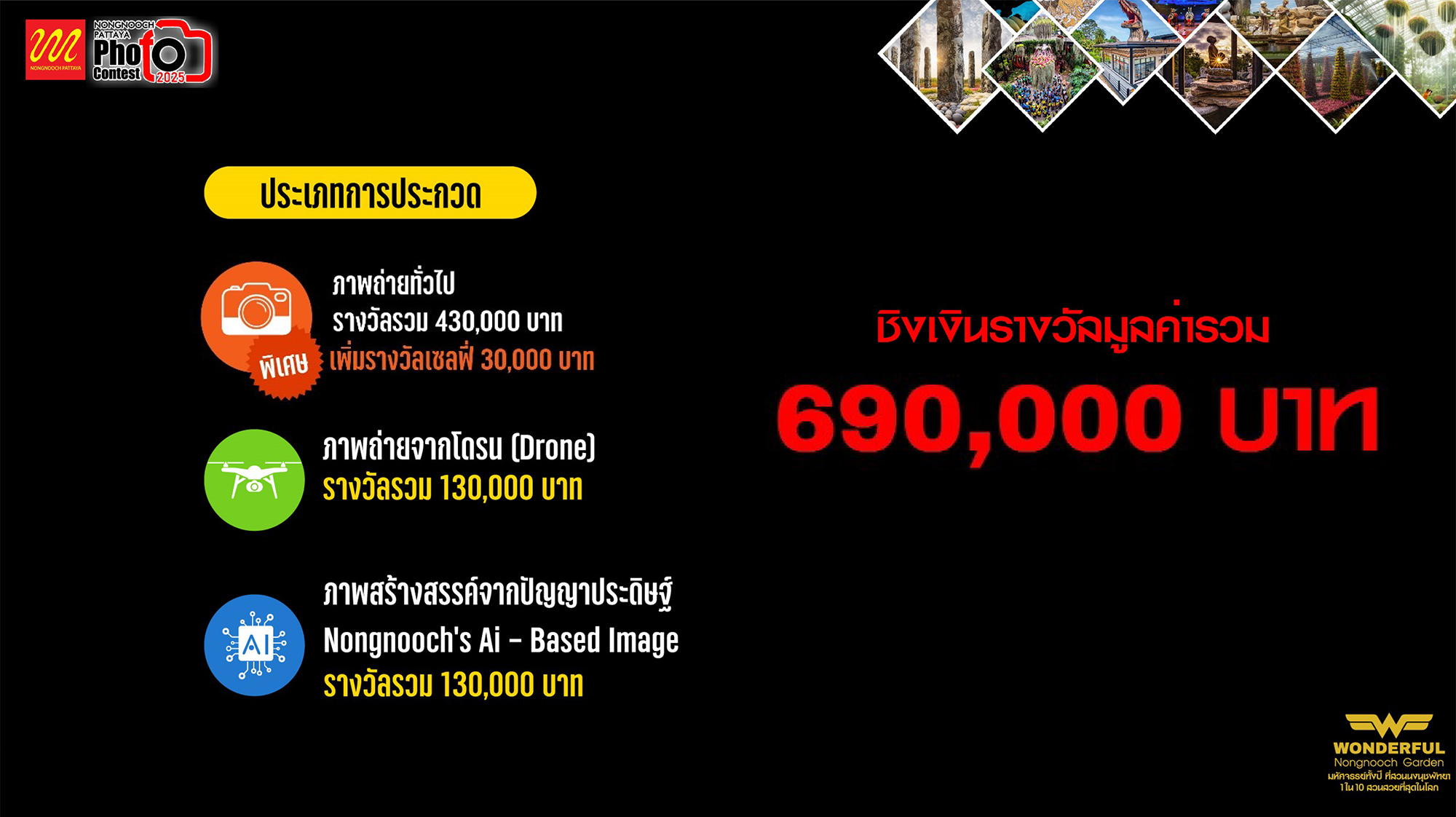 สวนนงนุช พัทยา จัดการประกวดภาพถ่าย, ภาพวิดีโอทางอากาศ (โดรน), และ AI เพื่อเป็นการส่งเสริมการท่องเที่ยวในประเทศไทย ในโครงการประกวดภาพถ่ายสวนนงนุช พัทยา 2025 “Wonderful Nongnooch Garden มหัศจรรย์ทั้งปี .. ที่สวนนงนุชพัทยา 1 ใน 10 สวนสวยที่สุดในโลก” ชิงเงินรางวัลรวมกว่า 690,000 บาท